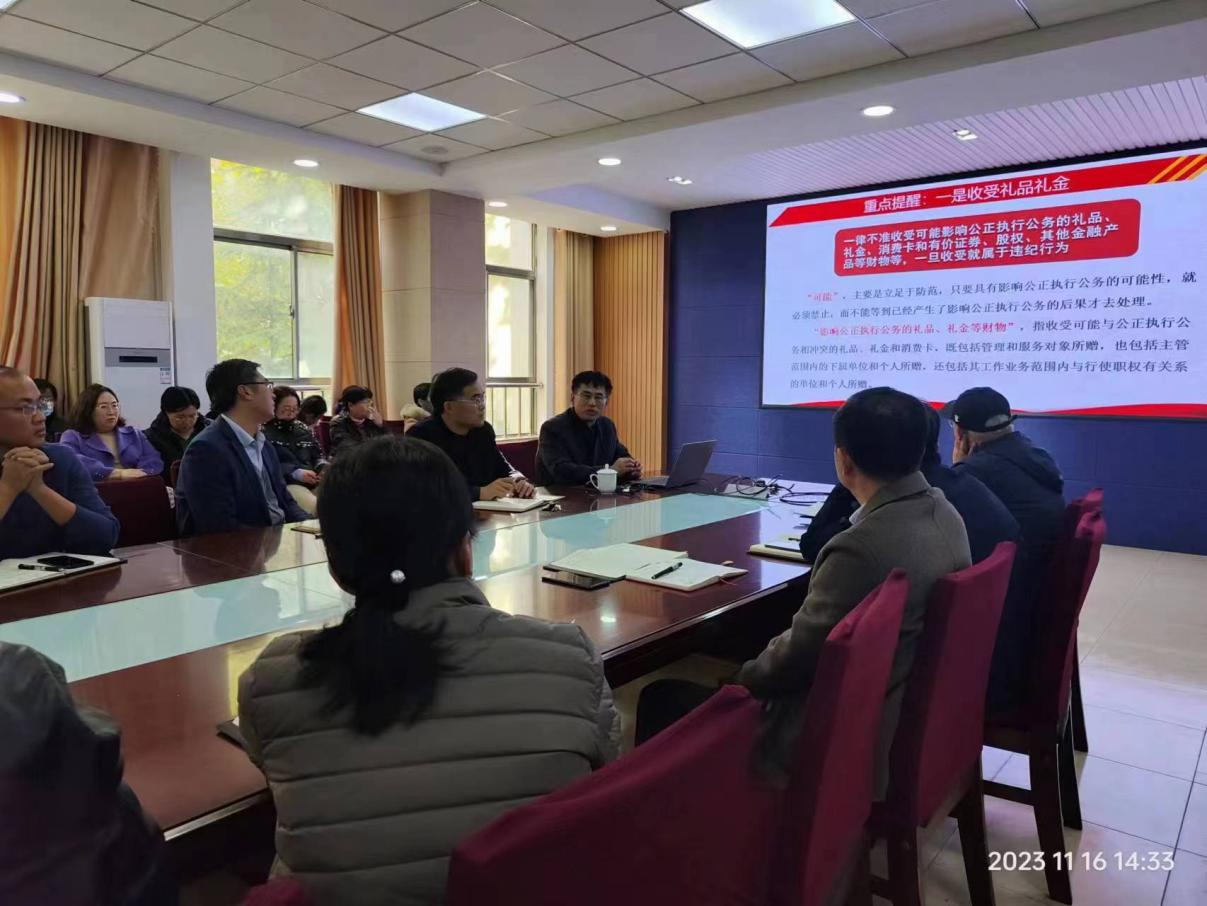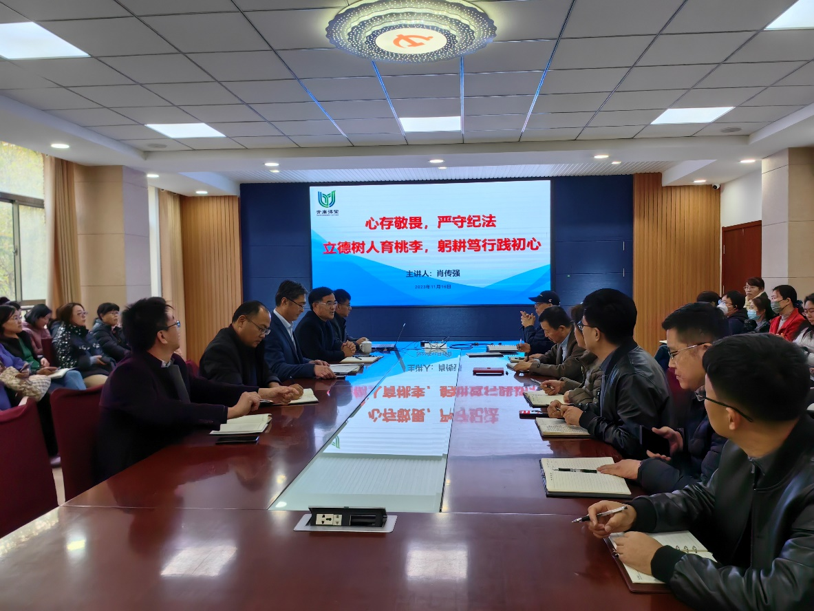 11月16日,伟德victor1946在信息楼215开展廉洁警示教育宣讲活动,公司邀请校纪委副书记肖传强进行“青廉课堂”授课,以“心存敬畏,严守纪法 立德树人育桃李,躬耕笃行践初心”为主题为公司全体教职工上了一堂生动的廉政专题党课。公司党委书记杨凯,经理徐鹏民,党委副书记、副经理岳斌,副处级组织员陈龙猛,副经理李吉忠、刘振斌及全体教职工参加。