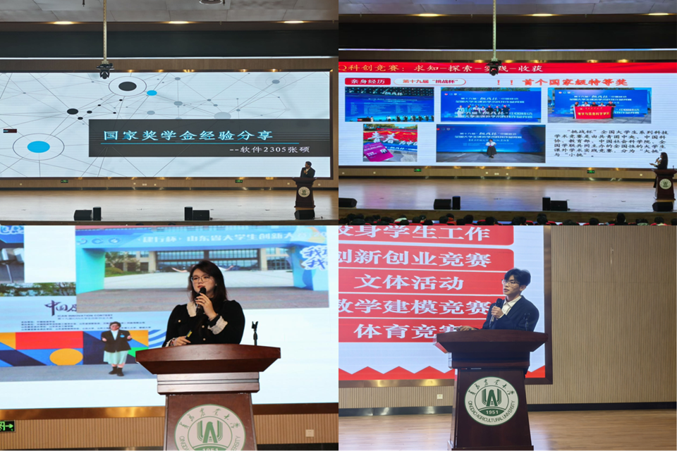 首先,在“楷光学海筑梦,奖助同行启智”主题中,国家奖学金获奖代表软件2203班郭旺、软件2305班张硕分享了成长与竞赛经验。他们激励大家正视成长路上的挑战与失利,潜心积淀学识与能力,实现学科成绩稳步提升与算法竞赛深度发展。省政府奖学金代表云计算2306班宋俪佳分享了“全面发展”心得,向同学们传授了高效学习方法,鼓励大家把握机遇、突破自我。